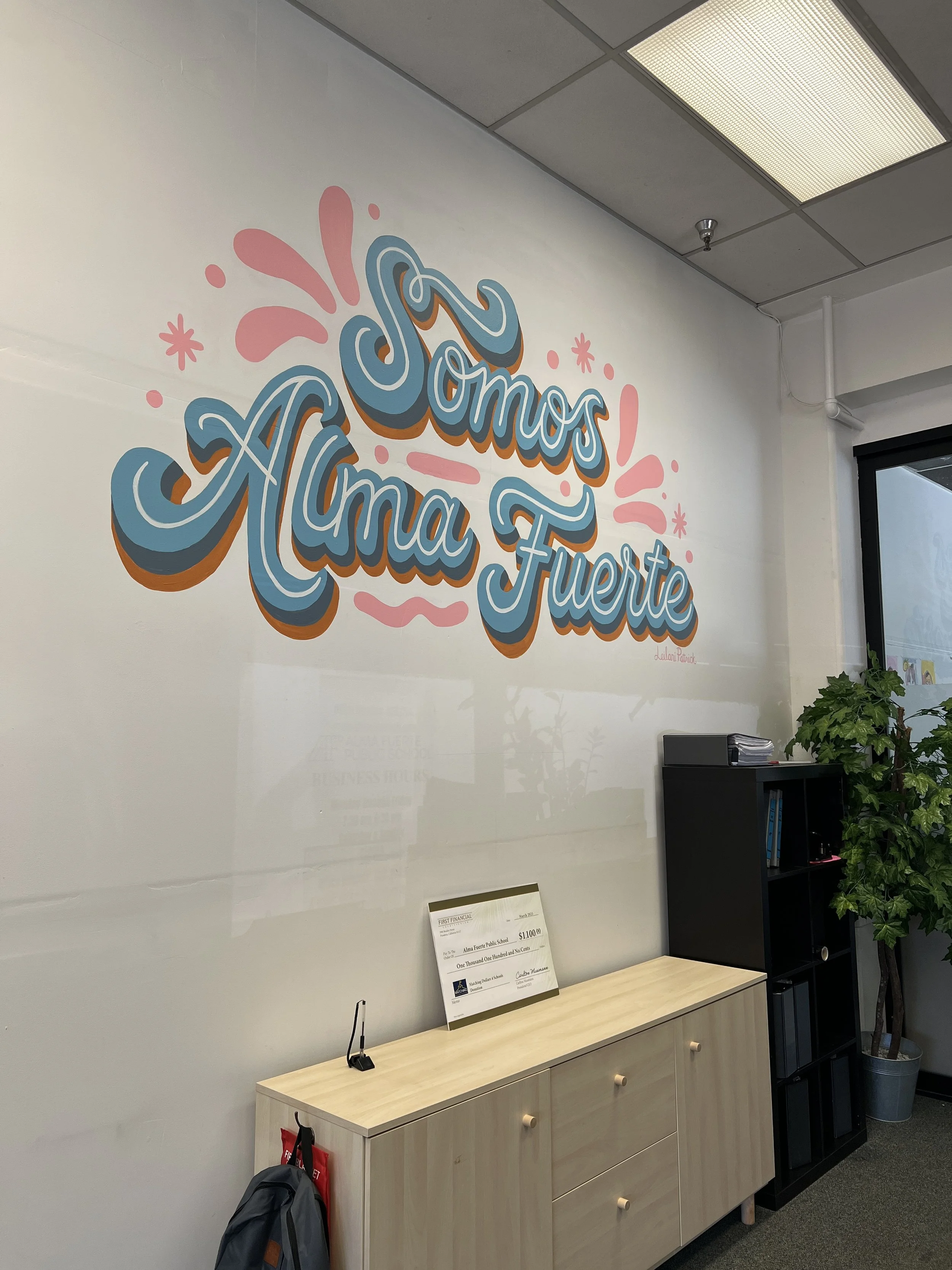 Earlier this year, Alma Fuerte was directly impacted by the California wildfires in Altadena, with many students and staff losing their homes. In the midst of this challenge, I developed a 23-page presentation that helped the school secure a critical charter renewal. I attended the board meeting where we won the vote and shortly after the big win, I painted my second mural. Since then I have continued to provide creative support that uplifts both staff and students. My work with Alma Fuerte is not only professional but also deeply personal, as the school community has become like family to me.